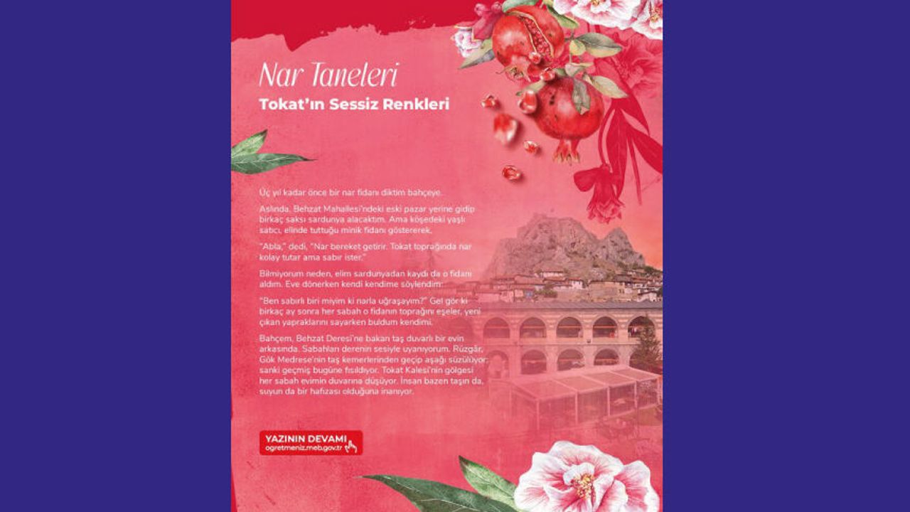 Deniz BÜYÜKBALYA’dan “Nar Taneleri – Tokat’ın Sessiz Renkleri” öyküsü ÖğretmenİZ dergisinde! Bir nar fidanıyla başlayan hikâye, şehrin hafızasına, sabırla tutulan dikişlere, toprağa sinmiş renklere uzanıyor… “Nar Taneleri - Tokat’ın Sessiz Renkleri”; Behzat Deresi’nin sesiyle, Yazmacılar Çarşısı’nın boyasıyla, taş evlerin gölgesinde büyüyen anılarla Tokat’ın kültürel belleğini lirik bir anlatımla okura taşıyor. Nar tanelerinde bereketi, dikiş ilmeklerinde sabrı, kadim şehirde kadın emeğini ve sessiz direnci anlatan bu öykü; geçmişle bugünü, hatırayla toprağı ince bir duyarlılıkla buluşturuyor.