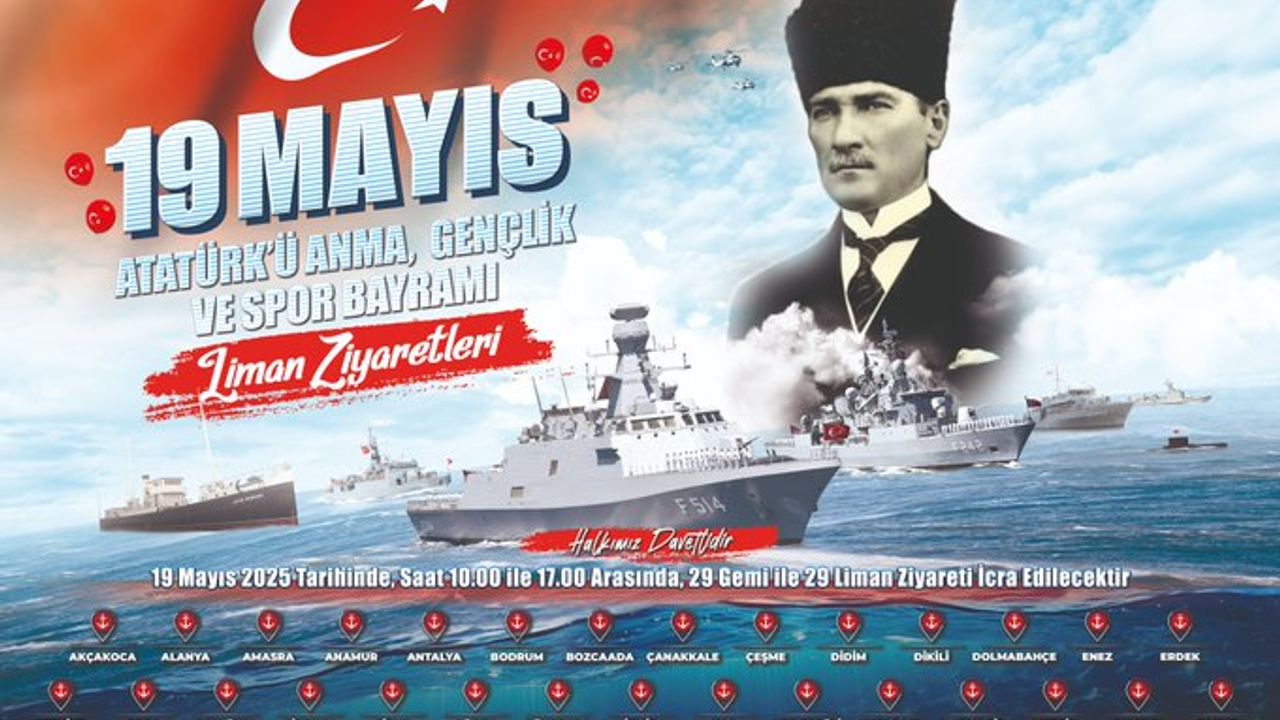 19 Mayıs 2025 19 Mayıs Atatürk’ü Anma, Gençlik ve Spor Bayramı kapsamında, Deniz Kuvvetlerimize ait 29 gemi ile 29 liman ziyareti gerçekleştirilecektir. Gemilerimiz 10.00 - 17.00 arası ziyarete açık olacaktır. Tüm halkımız davetlidir. #MillîSavunmaBakanlığı