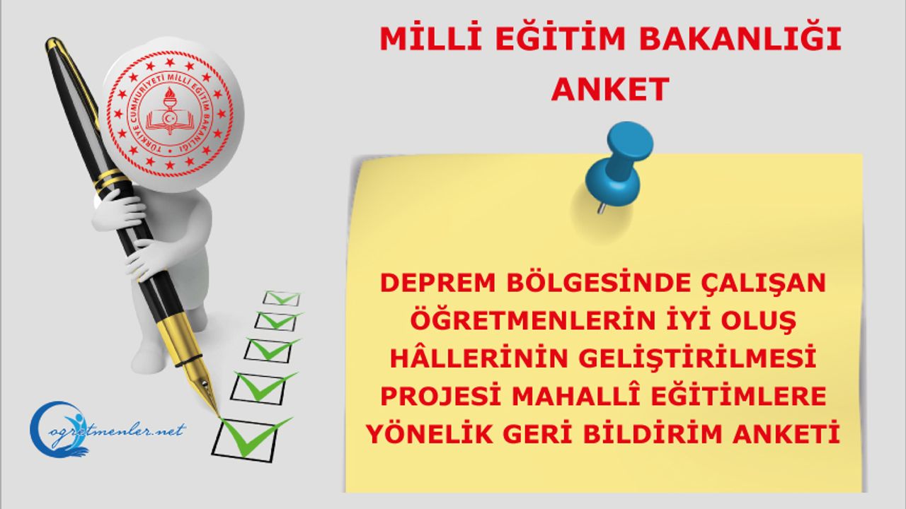 Deprem Bölgesinde Çalışan Öğretmenlerin İyi Oluş Hâllerinin Geliştirilmesi Projesi Mahallî Eğitimlere Yönelik Geri Bildirim Anketine katılmak için tıklayınız.