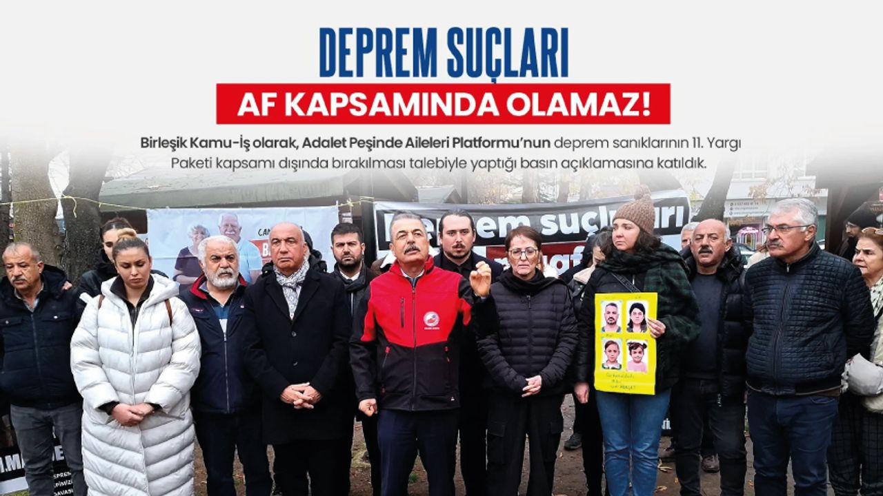 Birleşik Kamu-İş Konfederasyonu olarak Türkiye Büyük Millet Meclisi’nde görev yapan tüm milletvekillerine buradan bir kez daha sesleniyoruz. Halkın temsilcileri, sermaye çıkarları doğrultusunda değil, yurttaşların yaşam hakkını esas alarak karar vermekle yükümlüdür. Depremde hayatını kaybeden yurttaşlarımızın acıları henüz tazeyken, bu sorumlulara yönelik herhangi bir ceza indirimi ya da af düzenlemesi kabul edilemez.