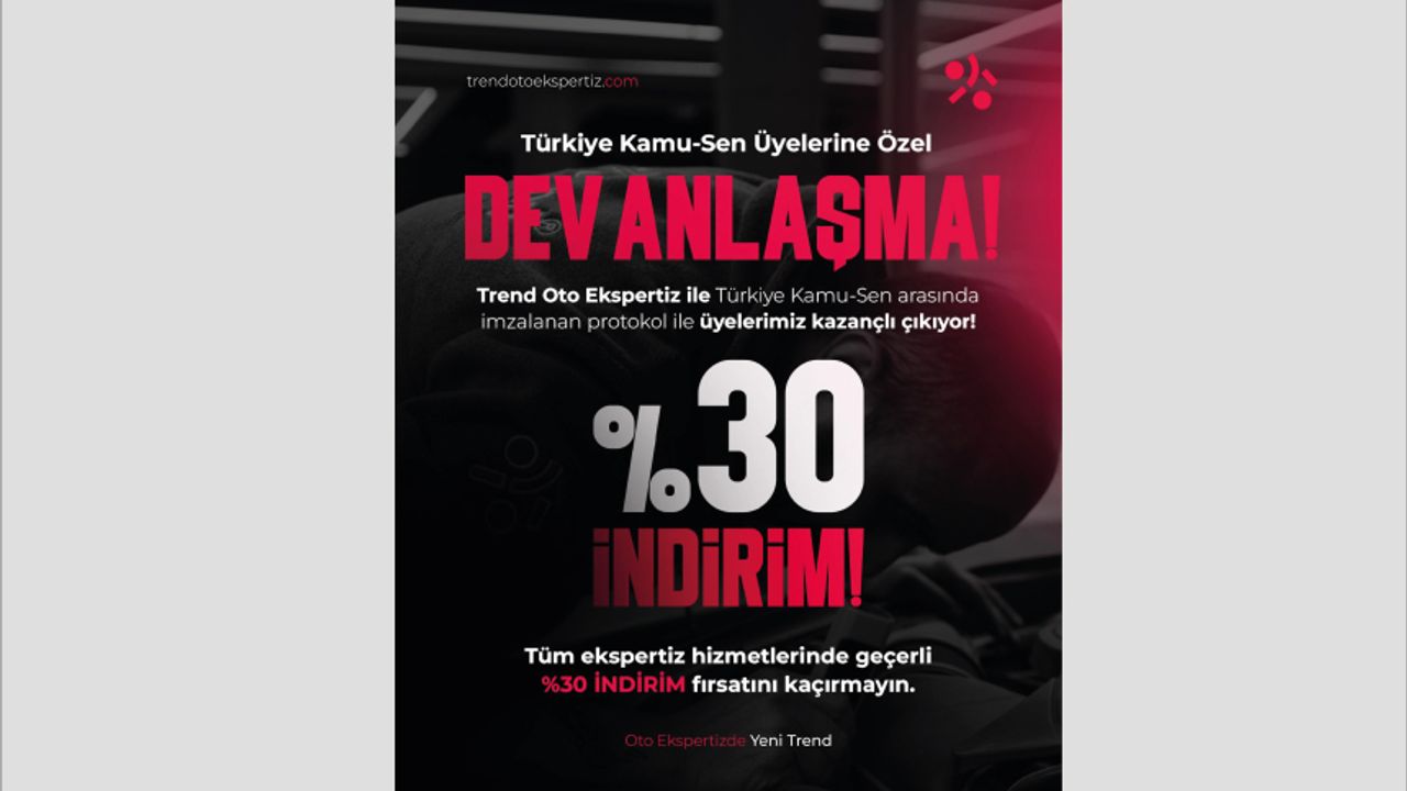 Trend Oto Ekspertiz ile Türkiye Kamu-Sen üyelerimize özel anlaşma imzaladık. Detayları aşağıdaki linkten takip edebilirsiniz! https://kamusen.org.tr/kampanyalar/konfederasyonumuz-ve-trend-oto-ekspertiz-arasinda-anlasma-imzalandi/5292/