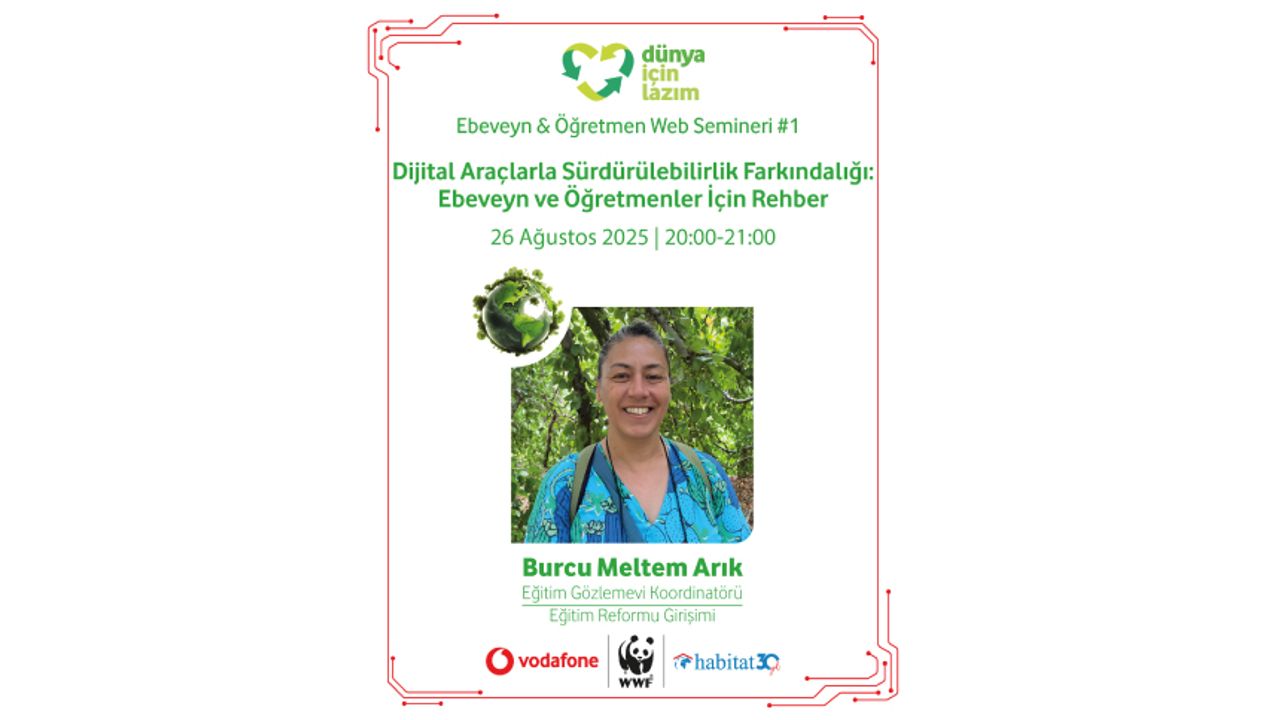 Vodafone, WWF-Türkiye ve Habitat Derneği iş birliğiyle yürütülen “Dünya İçin Lazım” projesi, çocuklar ve gençler başta olmak üzere toplumun farklı kesimlerinde çevre bilincini artırmayı, sürdürülebilir yaşam alışkanlıklarını teşvik etmeyi ve doğa ile uyumlu bir gelecek inşa etme bilincini yaygınlaştırmayı amaçlayan kapsamlı bir eğitim ve farkındalık programıdır. Bu seminerde, sürdürülebilirliği teorik olarak değil, günlük hayatın içine nasıl entegre edebileceğinizi; dijital araçların gücüyle çocukların ilgisini çekmenin yollarını ve kalıcı farkındalıklar yaratacak yöntemleri birlikte keşfedeceğiz. Eğer siz de çocukların doğayla bağ kurmasına rehberlik etmek, onların dünyayı anlamalarına ve dönüştürmelerine katkı sunmak istiyorsanız, Eğitim Reformu Girişimi Eğitim Gözlemevi Koordinatörü Burcu Meltem Arık’ın anlatımıyla gerçekleşecek bu ilham verici seminere başvurularınızı bekliyoruz. Eğitim içeriği Dijital Araçlarla Sürdürülebilirlik Farkındalığı: Ebeveyn ve Öğretmenler İçin Rehber Kimler eğitime katılabilir? Ebeveyn ve öğretmenler Seminer detayları nelerdir? Zoom platformu üzerinden çevrim içi olarak gerçekleştirilecektir. Kontenjan 250 kişi ile sınırlıdır. Eğitim Tarihi ve Saati: