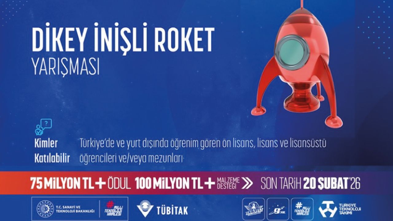 TÜBİTAK @Tubitak Hayalleri dünyaya sığmayan gençlerimizle; geleceğe ilham olan teknolojilere! Soğuk gaz itki sistemi ile çalışan roketlerin yere yumuşak inişinin simüle edildiği; Dikey İnişli Roket Yarışmamıza başvurularınızı bekliyoruz! Son başvuru tarihi: 20 Şubat 2026 Detaylar: https://teknofest.org/tr/yarismalar/dikey-inisli-roket-yarismasi/