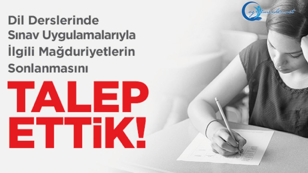 Türkçe, Türk Dili ve Edebiyatı ve Yabancı Dil derslerinde sınav uygulamalarıyla ilgili çelişkilerin giderilmesi ve öğretmenlerin ek ders mağduriyetinin sonlandırılmasını talep ettik.