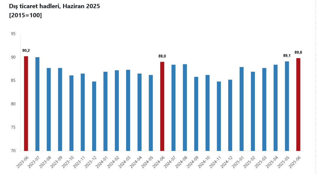 İhracat birim değer endeksinin ithalat birim değer endeksine bölünmesiyle hesaplanan ve 2024 yılı Haziran ayında 89,0 olarak elde edilmiş olan dış ticaret haddi, 0,8 puan artarak, 2025 yılı Haziran ayında 89,8 oldu.