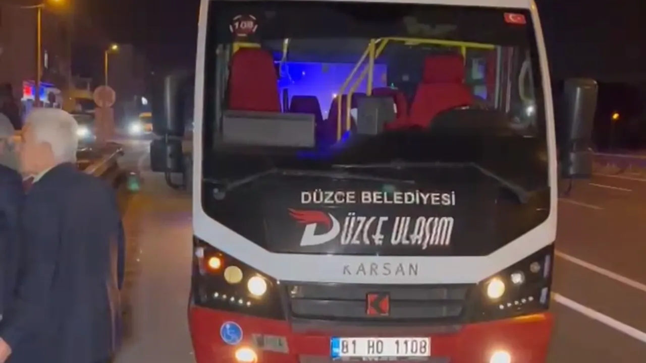 DÜZCE (İGFA) - Düzce Çoban mevkisi D-100 İstanbul istikametine seyir halinde olan Kaan A. ideresindeki 81 HO 1108 plakalı Düzce Belediyesine ait şehir içi yolcu taşımacılığı yapan minibüs Galatasaray şampiyonluk kutlamalarına katılmak için şehir merkezine gitmek isteyen ve yolun karşına geçtiği sırada kişiye çarptı. Çarpmanın etkisiyle yola savrulan ismi henüz öğrenilemeyen kişi ihbarı üzerine bölgeye gelen ambulans ile Düzce Atatürk Devlet Hastanesine kaldırıldı.