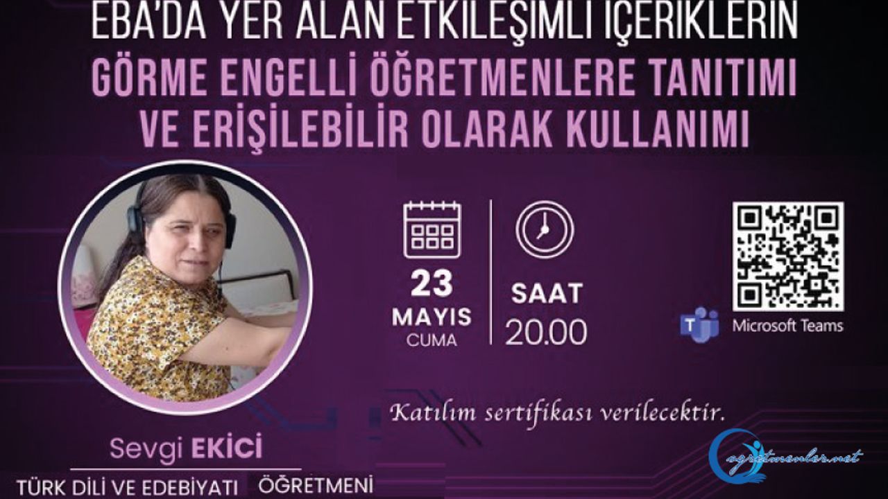 “Dijital Beceri Eğitimleri” Kapsamında "EBA'da Yer Alan Etkileşimli İçeriklerin Görme Engelli Öğretmenlere Tantımı ve Erişebilir Olarak Kullanımı" Çevrim İçi Eğitimlerimiz ve Atölyelerimiz Devam Ediyor. Bağlantı: https://meb.ai/19EWa6