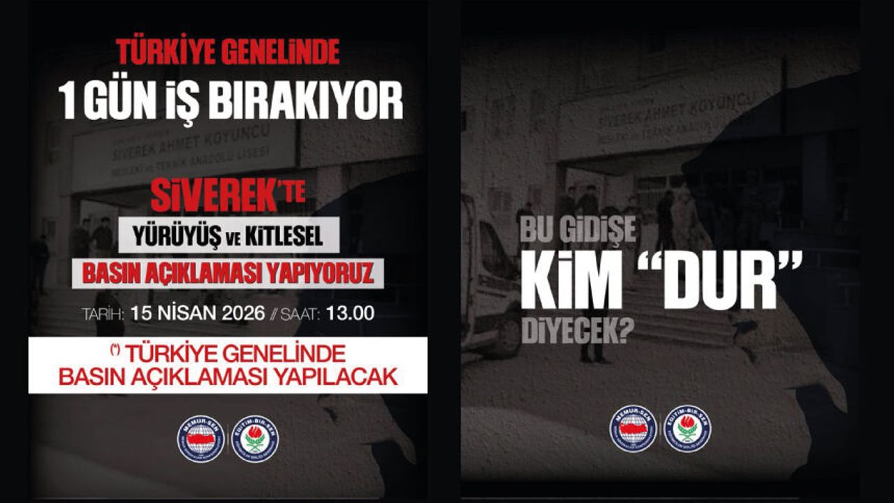 Siverek Ahmet Koyuncu Mesleki ve Teknik Anadolu Lisesi’nde okulun eski bir öğrencisi tarafından gerçekleştirilen saldırıyı protesto etmek; eğitimcilerimizi, öğrencilerimizi ve eğitim kurumlarımızı hedef alan şiddet eylemlerindeki artışa dikkat çekmek ve güvenli çalışma ortamının tesisi hususunda gerekli her türlü çalışmanın ivedilikle gerçekleştirilmesini haykırmak için 15 Nisan 2026 tarihinde Şanlıurfa genelinde iş bırakıyoruz. Aynı gün Siverek ilçesinde yürüyüş ve geniş katılımlı basın açıklaması yapacağız. Eş zamanlı olarak diğer illerde yapacağımız basın açıklamaları ile eğitimcileri ve eğitim kurumlarını hedef alan şiddet eylemlerini protesto edeceğiz.