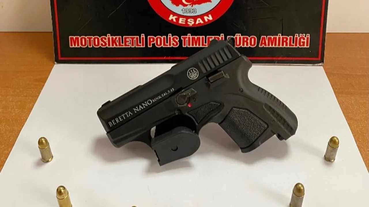 Edirne'nin Keşan ilçesinde polis denetiminde R.B. isimli şahsın üzerinde ruhsatsız tabanca, şarjör ve 6 fişek ele geçirildi. Şüpheli hakkında adli işlem başlatıldı.Süleyman BEZBAŞ / EDİRNE (İGFA) - Keşan İlçe Emniyet Müdürlüğü ekipleri, Büyük Cami Mahallesi Fevzi Çakmak Caddesi’nde gerçekleştirdiği denetim sırasında ruhsatsız silah yakaladı.