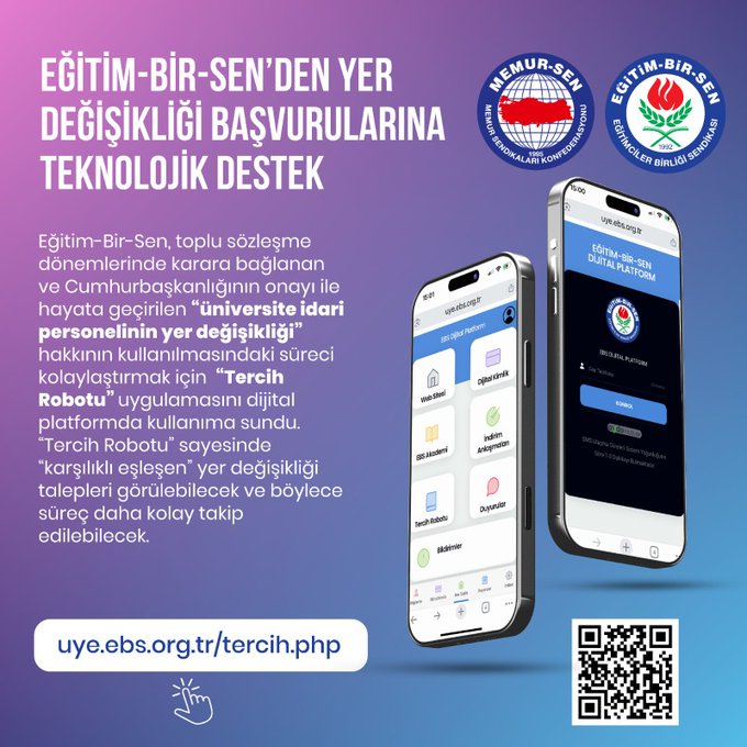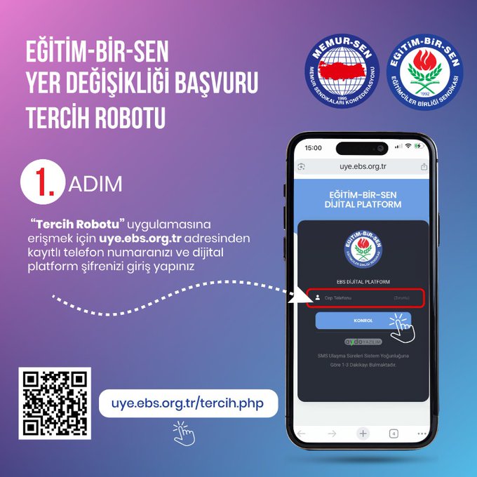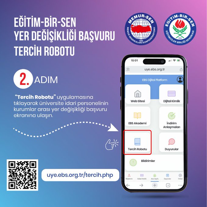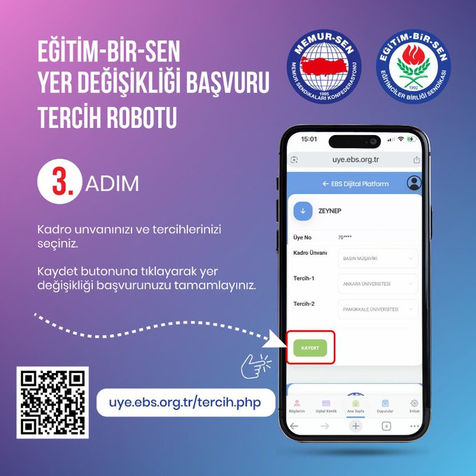 Karekodu okutarak ya da https://uye.ebs.org.tr/login.php adresinden uygulamaya ulaşın Kadro ünvanınızı seçin, tercihlerinizi oluşturun
