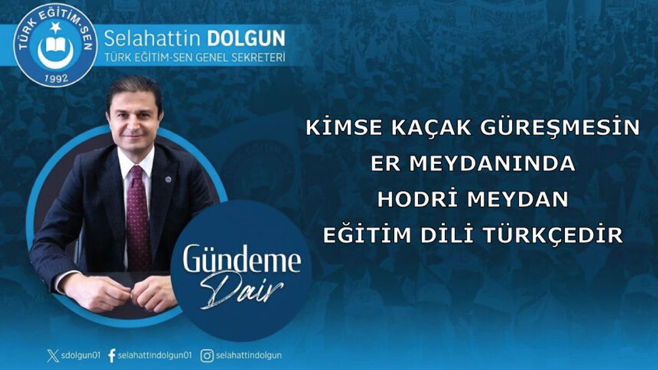 Eğitim dili Türkçedir.. Anayasamızın 42. Maddesinde ifade edildiği şekliyle Türkçeden başka dil kullanılamayacağını Türk Eğitim-Sen olarak kurulduğumuz günden bugüne söylüyoruz, söylemeye devam edeceğiz, duruşumuz nettir. Diğer sendikaların genel merkez düzeyinde,bu konuda bir açıklamaları var mı? Eğitim çalışanlarını bu bağlamda aydınlatmak gerekir diye düşünüyorum. Kimse kaçak güreşmesin,er meydanında hodri meydan. Selahattin Dolgun Türk Eğitim-Sen Genel Sekreteri