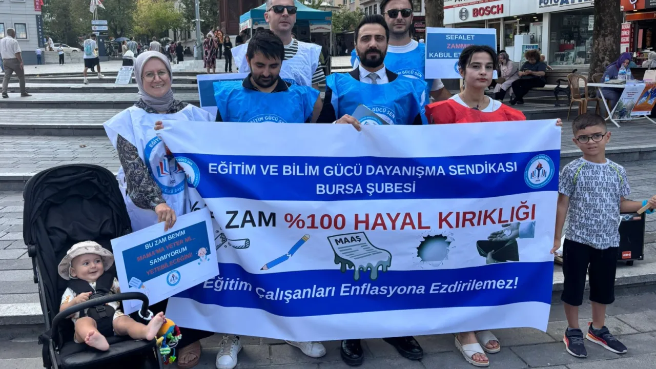 Eğitim Gücü Sen Bursa Şubesi, 8. dönem toplu iş sözleşmesindeki zam oranlarına tepki olarak iş bırakıp basın açıklaması yaptı. Şube Başkanı Okan Atar, hükümetin düşük zam tekliflerini ve yetkili sendikanın tutumunu eleştirerek, “Bu bir oyun sahnesi, kamu emekçisi sefalete mahkûm ediliyor” dedi.Adiviye ELBAŞ - gazeteabc / BURSA (İGFA) - Eğitim Gücü Sen Bursa Şubesi, 8. dönem toplu iş sözleşmesindeki zam oranlarına karşı 1 Eylül'de iş bırakarak basın açıklaması düzenledi.