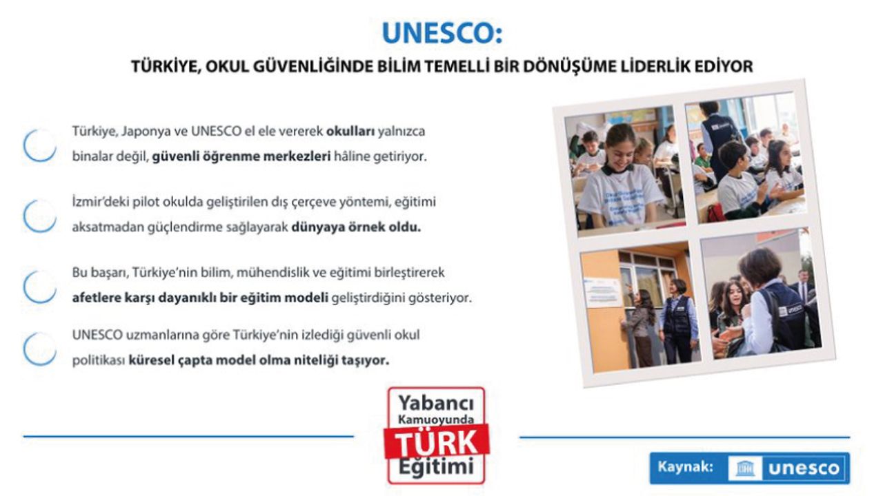 UNESCO, Millî Eğitim Bakanlığı ve Japonya Uluslararası İş Birliği Ajansı (JICA) ile yürütülen, Japonya Hükûmeti tarafından finanse edilen, “2023 Türkiye Depremlerine Yönelik Acil İyileştirme ve Eğitim Altyapısının Güçlendirilmesi Projesi” kapsamında, 6 Kasım 2025’te İzmir Bayındır’daki İsmet İnönü Ortaokulunda saha ziyareti gerçekleştirildi. İzmir Bayındır’daki İsmet İnönü Ortaokulu’nda uygulanan “dış çerçeve güçlendirme yöntemi”, daha uygun maliyetle etkili bir güçlendirme sağlaması, hız ve eğitim süreçlerini aksatmaması sayesinde UNESCO tarafından örnek bir mühendislik çözümü olarak değerlendirildi. Uzmanlar, Türkiye’nin uyguladığı modelin bütçe yönetimi, hızlı uygulama ve eğitimin devamlılığı açısından dünya ülkelerine ilham verecek nitelikte olduğunu ifade etti. JICA ve UNESCO temsilcileri, okul ziyaretlerinde öğretmen ve öğrencilerle bir araya gelerek afet bilincini artıran programlara katıldı. Öğrencilerin proje farkındalığı ve katılımı uluslararası heyet tarafından övgüyle karşılandı. UNESCO yetkilileri, Türkiye’deki modelin başarısını “Araştırmacılar, mühendisler ve eğitimcilerin ortak çalışması, bilimsel bilginin okul güvenliği politikalarına dönüşmesini sağlıyor.” sözleriyle ifade ettiler. Proje, yalnızca okul binalarının dayanıklılığını artırmayı değil, eğitimin kesintisiz sürmesi, kriz anlarında toplumun güvenli mekânlara erişimi ve çocukların psikososyal açıdan korunması gibi çok boyutlu hedefler de içeriyor. Proje kapsamında yürütülen çalışmalar, yalnızca teknik ilerlemeyi değil, eğitim diplomasisi, afet yönetimi ve uluslararası iş birliği boyutlarında da Türkiye’nin güçlü bir kapasiteye sahip olduğunu gösteriyor. UNESCO’nun değerlendirmesine göre Türkiye, bu projeyle eğitim ve afet direncini entegre eden yenilikçi bir yaklaşıma öncülük ediyor. Ortaya konan model, geleceğin okullarının nasıl olması gerektiğine dair küresel bir referans niteliği taşıyor. Kaynak: https://unesco.org/en/articles/bridging-education-and-safety-advancing-earthquake-resilient-schools-turkiye