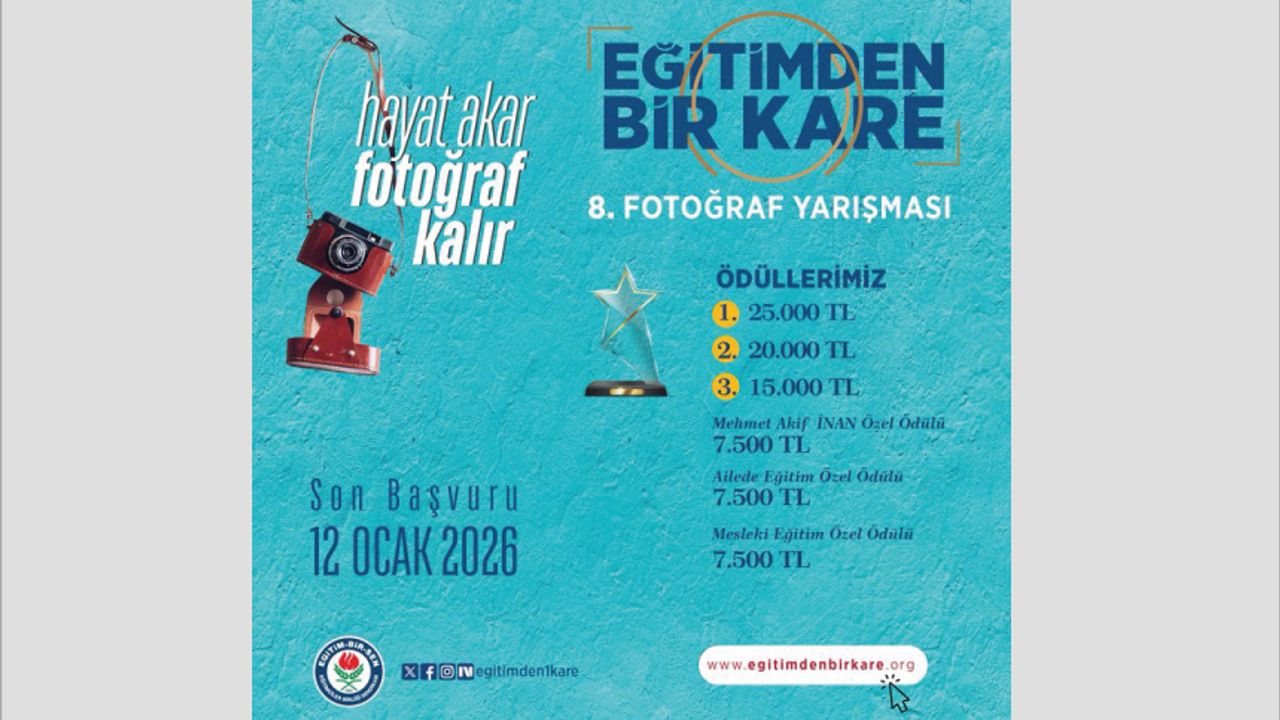 “Eğitimden Bir Kare” fotoğraf yarışmasında kadrajlar eğitime odaklanıyor. Eğitimi tüm boyutlarıyla görünür kılmak, verilen emekleri fotoğrafın gücüyle yansıtmak için düzenlediğimiz yarışmamıza başvurular sürüyor. Ödüller 25.000 TL 20.000 TL 15.000 TL “Mehmet Akif İnan Özel Ödülü”: 7.500 TL “Ailede Eğitim” ve “Mesleki Eğitim” özel ödülleri: 7.500 TL Sergileme: 2.500 TL Hemen Başvur: http://egitimdenbirkare.org #EğitimdenBirKare #FotoğrafYarışması #EğitimBirSen