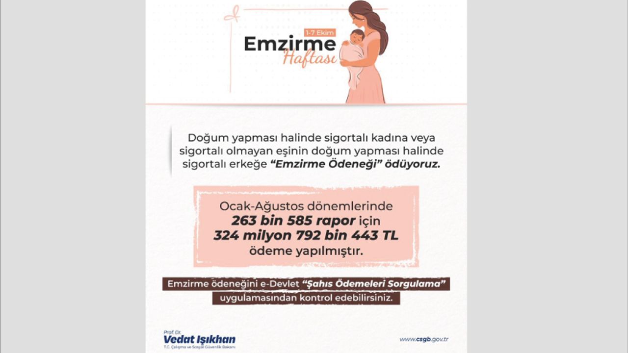 Sosyal Güvenlik Kurumumuzun sağladığı Emzirme Ödeneği ile ailelerimizin yanındayız. Bu yılın Ocak-Ağustos döneminde 263 binden fazla rapor için toplam 325 milyon TL’ye yakın ödeme yaptık. Yeni hayatlara destek olmaya, ailelerimizi güçlendirmeye devam edeceğiz. 1-7 Ekim #EmzirmeHaftası