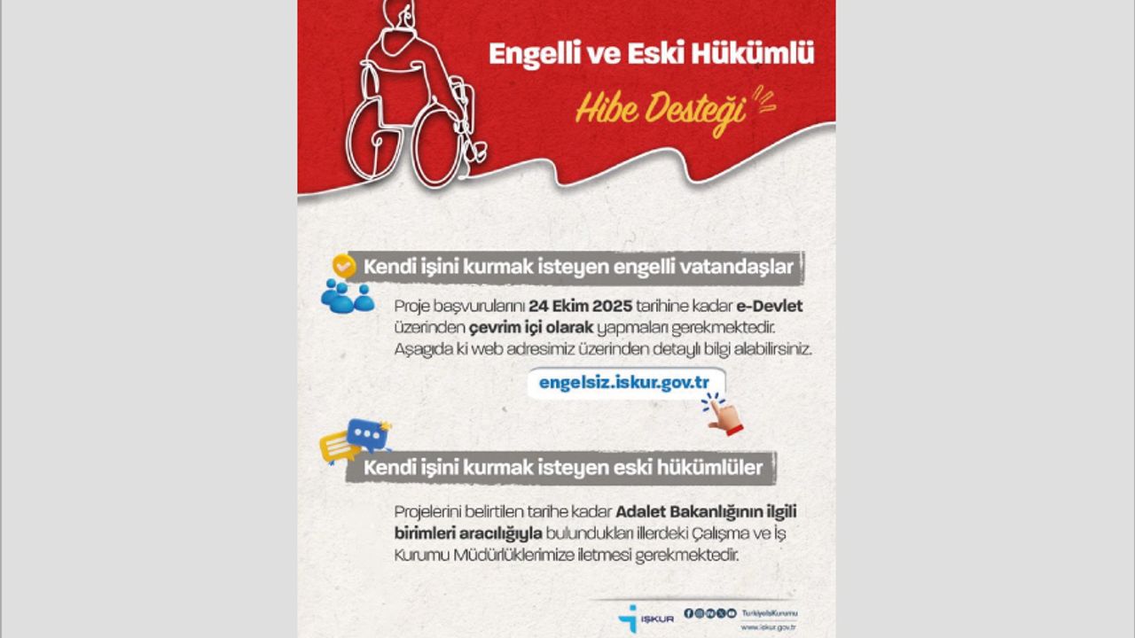 Engelli ve Eski Hükümlü Hibe Desteğine Başvuru için Son 5 Gün… Son Başvuru Tarihi: 24 Ekim 2025 Detaylı Bilgi için: http://engelsiz.iskur.gov.tr adresini ziyaret edebilirsiniz.