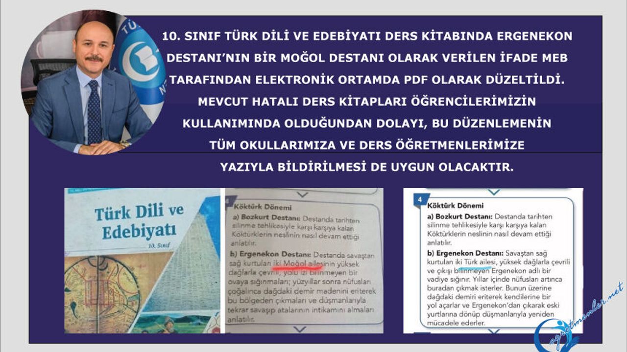 10. Sınıf Türk Dili ve Edebiyatı ders kitabında Ergenekon Destanı’nın bir Moğol destanı olarak verilen ifade MEB tarafından elektronik ortamda PDF olarak düzeltildi.