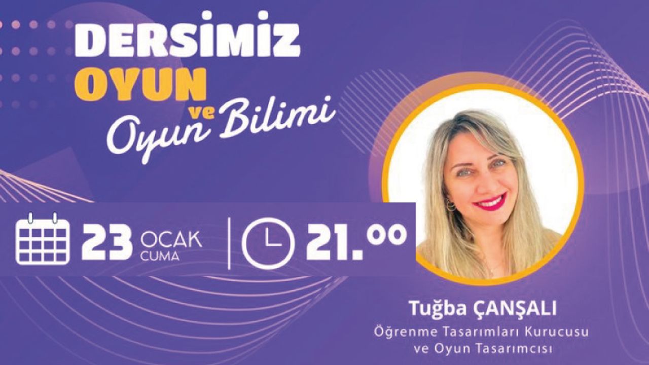 eTwinning Meslekî Gelişim Çevrim İçi Eğitimleri Devam Ediyor Dersimiz Oyun ve Oyun Bilimi Tuğba ÇANŞALI - Öğrenme Tasarımları Kurucusu ve Oyun Tasarımcısı 23 Ocak Cuma 21.00 Bağlantı: https://meb.ai/UzMV1N4 Toplantı Kimliği: 365 604 074 202 67