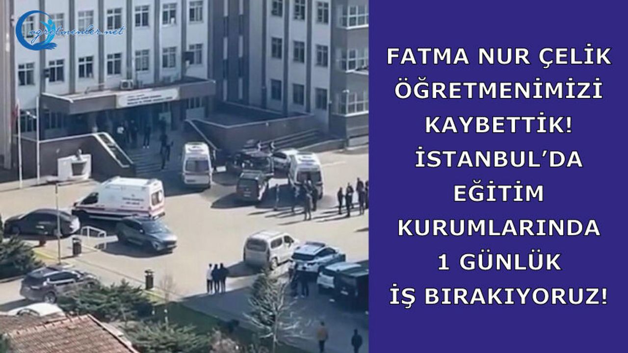 Fatma Nur Çelik Öğretmenimizi Kaybettik ! İstanbul-Çekmeköy Taşdelen Borsa İstanbul Mesleki ve Teknik Anadolu Lisesi’nde 11.Sınıfta okuyan ve disiplinsizliği bulunan bir öğrenci, kesici aletle gerçekleştirdiği saldırıda iki öğretmenimizi ve bir öğrencimizi yaralamıştır. Ağır yaralı olarak hastaneye kaldırılan Fatma Nur Çelik öğretmenimiz hayatını kaybetmiştir. Öğretmenimizin ailesine ve eğitim camiamıza başsağlığı diliyoruz. Tedavisi devam eden meslektaşımıza ve öğrencimize acil şifalar diliyor, bu vesileyle okullarımızda güvenlik açığı oluşmaması için gerekli önlemlerin alınması çağrısında bulunuyoruz. Okulların güvenliğine dikkat çekmek, Fatma Nur Çelik öğretmenimizi uğurlamak ve şiddete tepki koymak için İstanbul’da eğitim kurumlarında 1 GÜNLÜK İŞ BIRAKIYORUZ!
