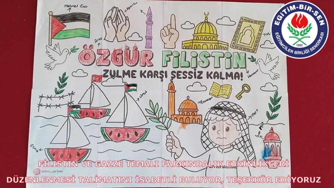 Eğitim-Bir-Sen olarak, Filistin halkının haklı mücadelesini desteklemeyi bir insanlık görevi olarak görüyor, bu duyarlılığın Milli Eğitim Bakanlığının yayımladığı yazı ile Filistin ve Gazze temalı farkındalık etkinliklerine dönüşmesinden mutluluk duyuyoruz. Bu anlamlı karardan dolayı Milli Eğitim Bakanı Yusuf Tekin’in şahsında tüm Bakanlık teşkilatına ve alınan kararı çocuklarımızla buluşturan öğretmenlerimize teşekkür ediyoruz.