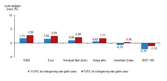 Yİ-ÜFE ile indirgendiğinde; yatırım araçlarından Devlet İç Borçlanma Senetleri (DİBS) %3,68, mevduat faizi (brüt) %1,79, Euro %1,47 ve Amerikan Doları %0,17 oranlarında yatırımcısına reel getiri sağlarken; külçe altın %0,47 oranında yatırımcısına kaybettirdi. TÜFE ile indirgendiğinde ise Devlet İç Borçlanma Senetleri (DİBS) %3,34, mevduat faizi (brüt) %1,46 ve Euro %1,15 oranlarında yatırımcısına reel getiri sağlarken; Amerikan Doları %0,16 ve külçe altın %0,79 oranlarında yatırımcısına kaybettirdi.