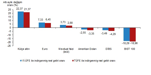 Altı aylık değerlendirmeye göre külçe altın; Yİ-ÜFE ile indirgendiğinde %21,98, TÜFE ile indirgendiğinde ise %22,87 oranlarında yatırımcısına en yüksek reel getiri sağlayan yatırım aracı olurken; aynı dönemde BIST 100 endeksi, Yİ-ÜFE ile indirgendiğinde %8,92, TÜFE ile indirgendiğinde ise %8,26 oranlarında yatırımcısına en çok kaybettiren yatırım aracı oldu.