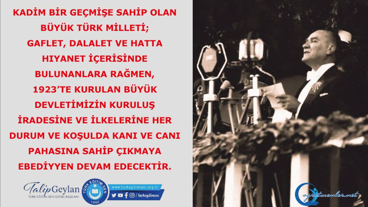 Kadim bir geçmişe sahip olan büyük Türk Milleti; gaflet, dalalet ve hatta hıyanet içerisinde bulunanlara rağmen, 1923’te kurulan büyük devletimizin kuruluş iradesine ve ilkelerine her durum ve koşulda kanı ve canı pahasına sahip çıkmaya ebediyyen devam edecektir.