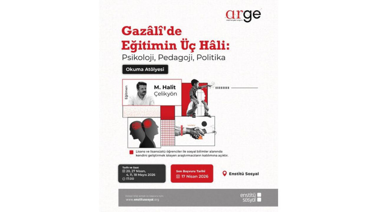 Gazâlî’nin eğitim düşüncesini psikoloji, politika ve pedagoji ekseninde yeniden okumaya hazır mısınız? Araştırmacı Gelişim Programı kapsamında “Gazâlî’de Eğitimin Üç Hâli” Okuma Atölyesi başlıyor. M. Halit Çelikyön moderatörlüğünde gerçekleşecek beş haftalık programda, bireyin zihinsel ve ruhsal inşası, eğitimde kuşaklar arası aktarım süreçleri ve toplumsal nizamın ahlaki temelleri, temel eserler üzerinden ele alınacak. Lisans ve lisansüstü düzeyindeki öğrencilere ve araştırmacılara yönelik olan bu atölye, 20 Nisan - 18 Mayıs 2026 tarihleri arasında Enstitümüzde yüz yüze gerçekleştirilecektir. Detaylı bilgi ve başvuru formu için biyografimizdeki bağlantıyı ziyaret edebilirsiniz. https://enstitusosyal.org/etkinliklerimiz/arastirmaci-gelisim-programi/arastirmaci-gelisim-programi-gazali-de-egitimin-uc-hali-psikoloji-pedagoji-politika-atolyesi-basliyor