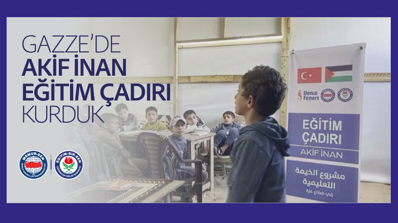 Eğitim-Bir-Sen olarak, siyonist İsrail’in yakıp yıktığı, on binlerce insanı katlettiği Gazze’ye destek olmaya, Gazzelilerin yanında olmaya devam ediyoruz. Deniz Feneri Derneği ile birlikte Gazze’de, kurucu genel başkanımız Mehmet Akif İnan’ın adını taşıyan bir eğitim çadırı kurduk. Akif İnan Eğitim Çadırı’yla Gazzeli çocukların eğitimine destek olmayı, katkıda bulunmayı sürdüreceğiz.