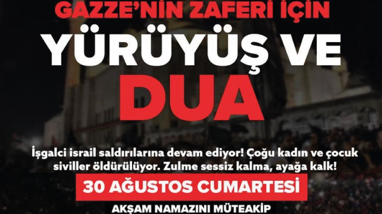 Gazze’nin Zaferi İçin Yürüyüş ve Dua! İşgalci İsrail saldırılarına devam ediyor! On binlerce sivil öldürülüyor. Zulme sessiz kalma, ayağa kalk! Gazze’deki kardeşlerimiz için Fatih Camii’nden Saraçhane’ye yürüyoruz. Mazlumların yanında saf tutmak için seni de bekliyoruz! 30 Ağustos Cumartesi Akşam Namazını Müteakip Başlangıç: Fatih Camii Varış: Saraçhane