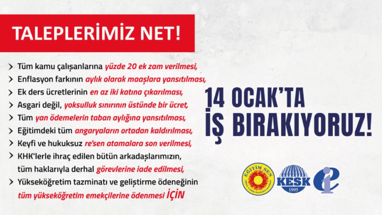 Bu nedenle; tüm angarya görevlere, yoksulluğa ve adaletsizliğe karşı 14 Ocak’ta iş bırakıyoruz!