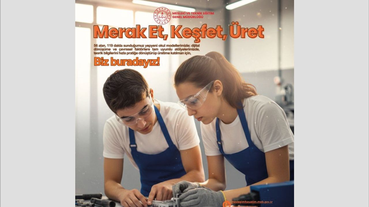 Sevgili Gençler, Geleceğe yön veren meslekler ve teknik eğitimle dolu bir dünya seni bekliyor! Meslekî ve Teknik Ortaöğretim Kurumları olarak, öğrencilerimizi geleceğin dünyasına hazırlıyor, onların merak etmelerini, keşfetmelerini ve üretmelerini sağlıyoruz. 56 alan, 119 dalda yepyeni okul modellerimizle, dijital dönüşümün ve çevresel faktörlerin gerekliliklerine tam uyumlu atölyelerimizde, teorik bilgilerini hızla pratiğe dönüştürüp üretime katılman için #BizBuradayız Daha fazla bilgi : http://mtegm.meb.gov.tr