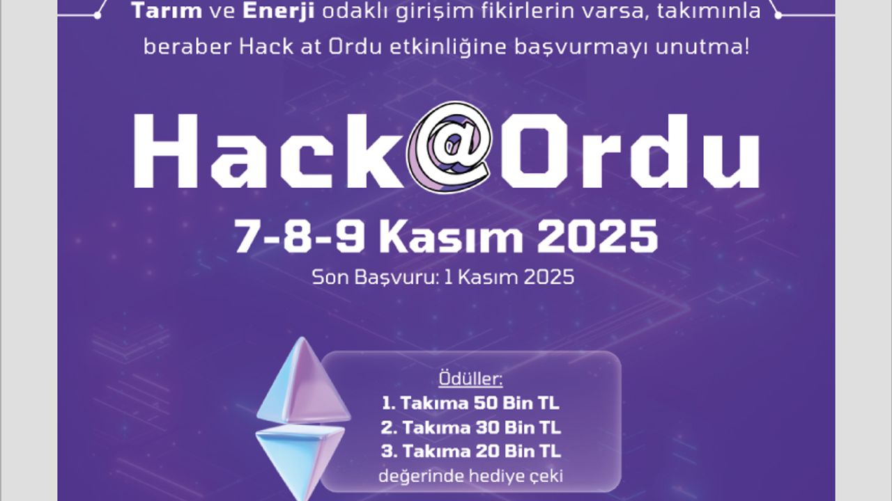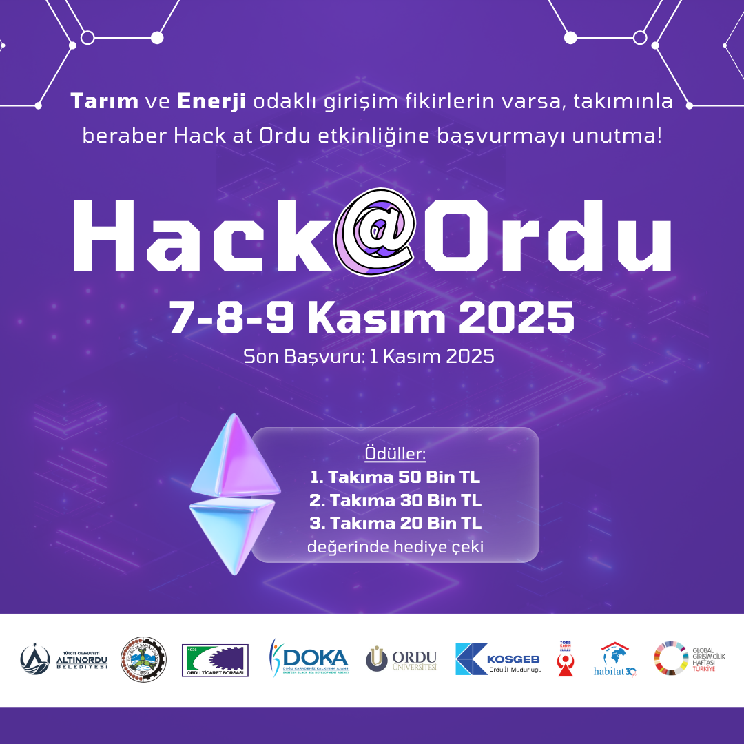 Bu yıl “Yapay Zeka ile Geleceği Tasarla” temasıyla düzenlenen Hack@Ordu, 7–9 Kasım 2025 tarihlerinde Ordu’da gerçekleşecek. Üç gün sürecek bu girişimcilik maratonunda katılımcılar, fikirlerini geliştirip prototiplerini oluşturacak, eğitimler ve mentorluk desteği alacak, jüriye sunum yaparak ödül kazanma şansı elde edecekler!