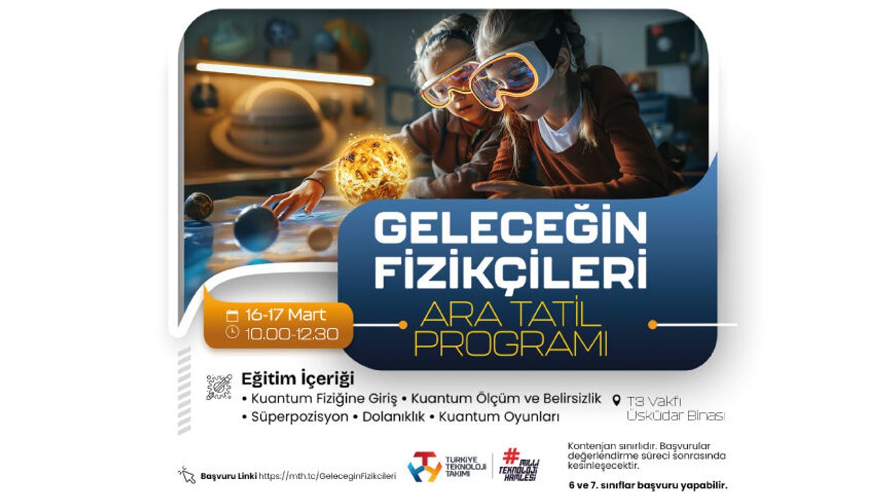 6. ve 7. sınıf öğrencileri, 16-17 Mart tarihlerinde T3 Vakfı Binası’nda gerçekleşecek bu özel programla fiziğin heyecan verici dünyasını keşfedecek. Program saat 10.00 – 12.30 arasında olacak ve iki gün boyunca birbirinden eğlenceli aktivitelerle dolu!