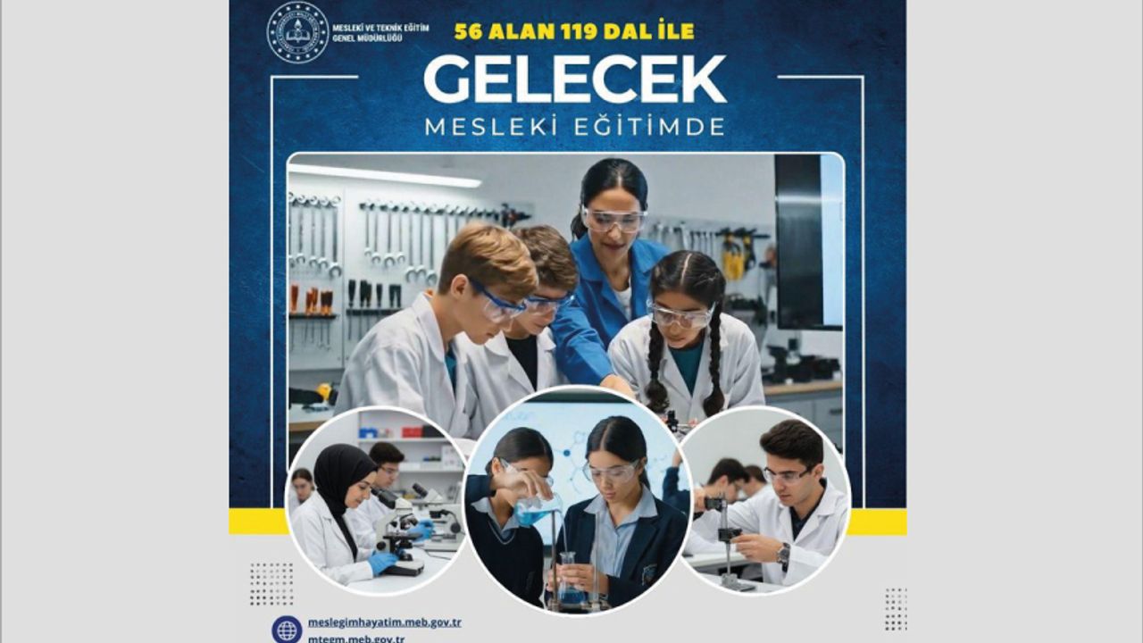 Sevgili Gençler, Unutmayın: "Başarı, hazırlıklarınızın fırsatla buluştuğu noktadır." Mâziden âtiye aktardığımız köklü tecrübe, modern atölye ve laboratuvar imkanlarıyla seni geleceğe hazırlıyoruz! 56 alan 119 dalda başarılı bir kariyer için yerin hazır. Seni bekliyoruz! GELECEK, MESLEKÎ EĞİTİMDE! http://mtegm.meb.gov.tr