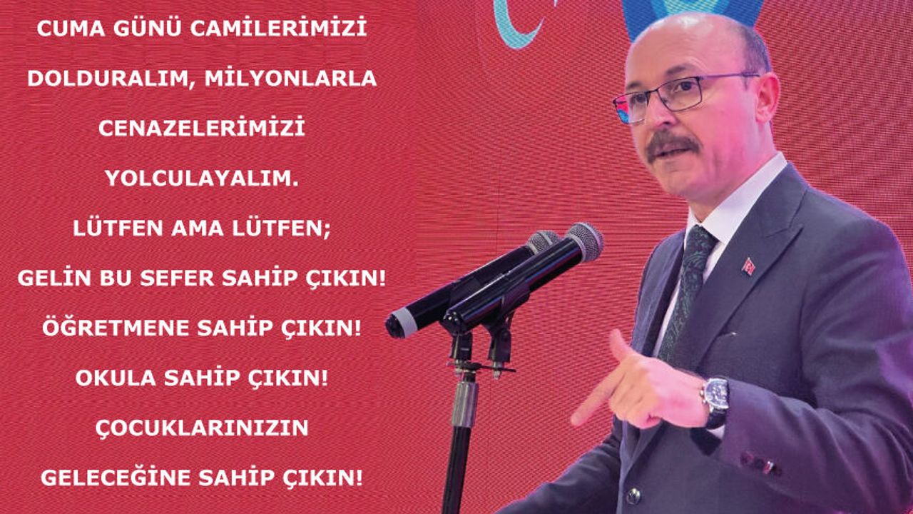 Tüm vatandaşlarımıza da çağrıda bulunuyorum: Cuma günü camilerimizi dolduralım, milyonlarla cenazelerimizi yolculayalım. Lütfen ama lütfen; gelin bu sefer sahip çıkın! Öğretmene sahip çıkın! Okula sahip çıkın! Çocuklarınızın geleceğine sahip çıkın! Ailelerimize, eğitim camiamıza ve aziz milletimize sabır ve başsağlığı niyaz ediyoruz.