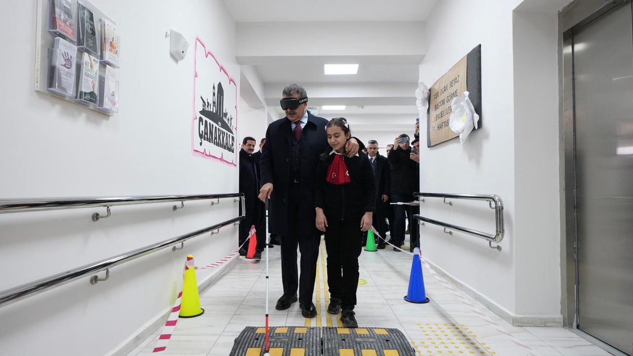 Okulu gezen ve sınıfları ziyaret eden Tekin, öğrenci ve öğretmenlerle sohbet etti. Göz bandı ile gözlerini kapatıp bir öğrenci eşliğinde beyaz bastonla yürüyen Bakan Tekin, farkındalık mesajı verdi.