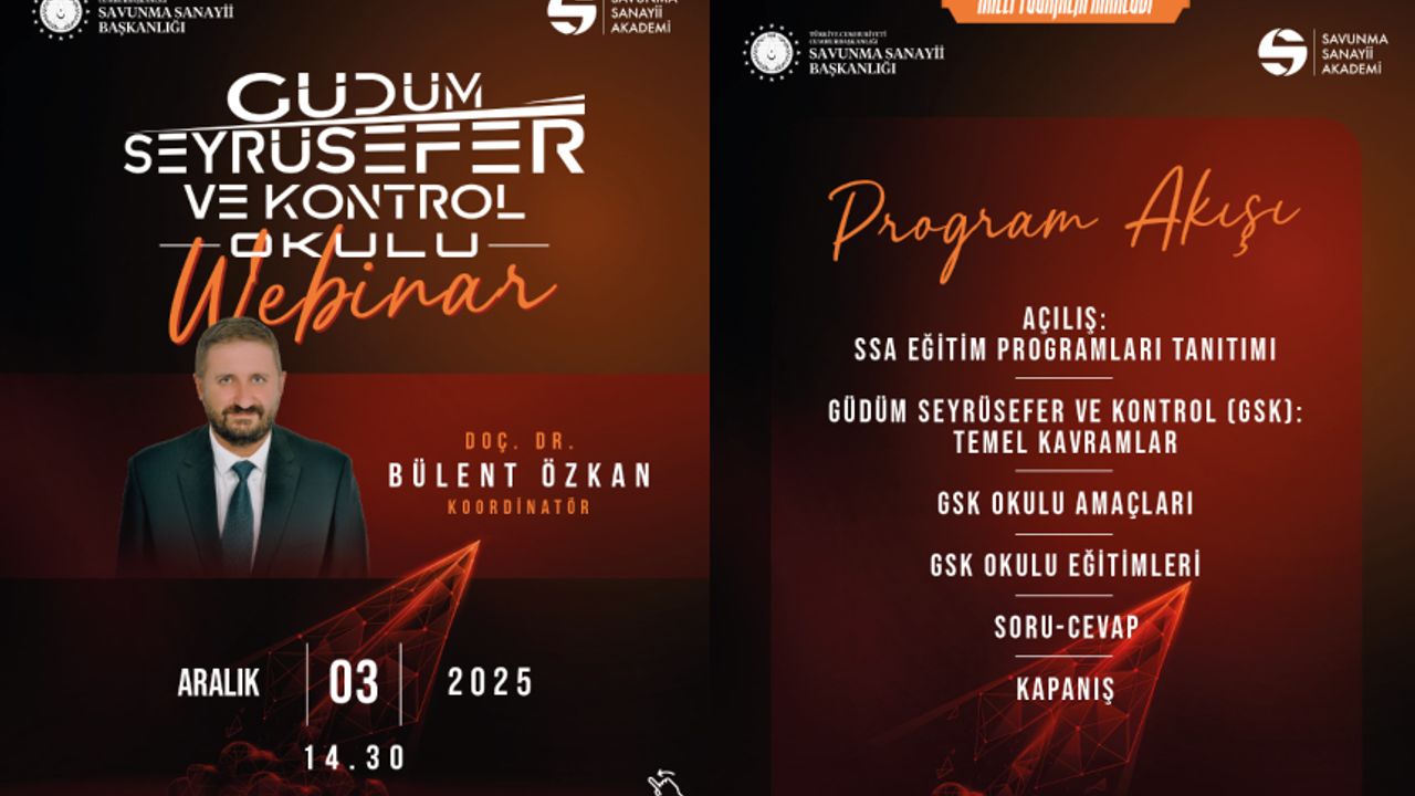 Milli Yetkinlik Hamlesi kapsamında hayata geçirilen Güdüm Seyrüsefer ve Kontrol Okulu’nun tanıtılacağı ve 3 Aralık günü Savunma Gelişim üzerinden yayınlanacak Webinar’ımızın program akışı sizlerle