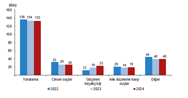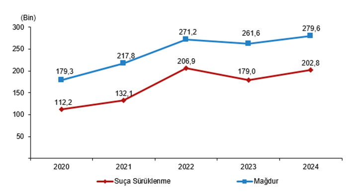Güvenlik birimlerine gelen veya getirilen çocukların karıştığı olay sayısı 2024 yılında, 2023 yılına göre %9,8 oranında artarak 612 bin 651 oldu. Bu olaylarda çocukların 279 bin 620'si mağdur olarak 202 bin 785'i suça sürüklenme sebebiyle (kanunlarda suç olarak tanımlanan bir fiili işlediği iddiasıyla), 96 bin 438'i bilgisine başvurma amacıyla, 18 bin 561'i kayıp (hakkında kayıp müracaatı yapılıp daha sonra bulunan) olması sebebiyle, 8 bin 729'u kabahat işlediği iddiasıyla, 6 bin 518'i ise bu nedenlerin dışında kalan diğer nedenlerden dolayı güvenlik birimlerine geldi veya getirildi.