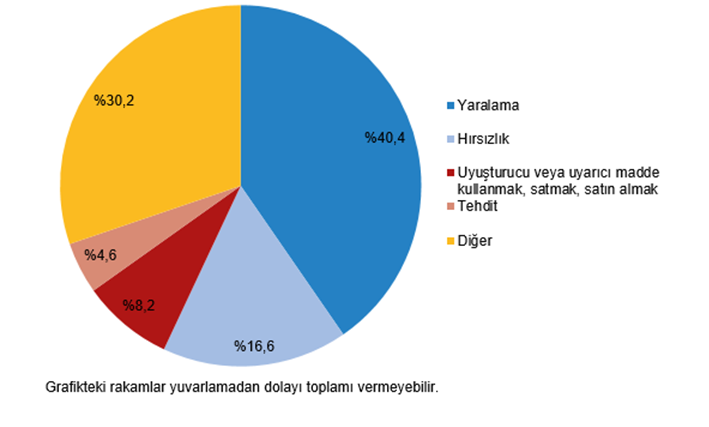 Güvenlik birimine gelen veya getirilen çocukların karıştığı olayların 202 bin 785'i suça sürüklenme nedeni ile gerçekleşti. Bu çocukların %40,4'üne yaralama, %16,6'sına hırsızlık, %8,2'sine uyuşturucu veya uyarıcı madde kullanmak, satmak veya satın almak, %4,6'sına tehdit, %4,2'sine genel tehlike yaratan suçlar, %26,0'ına ise bu nedenlerin dışında kalan diğer suçlar isnat edildi.
