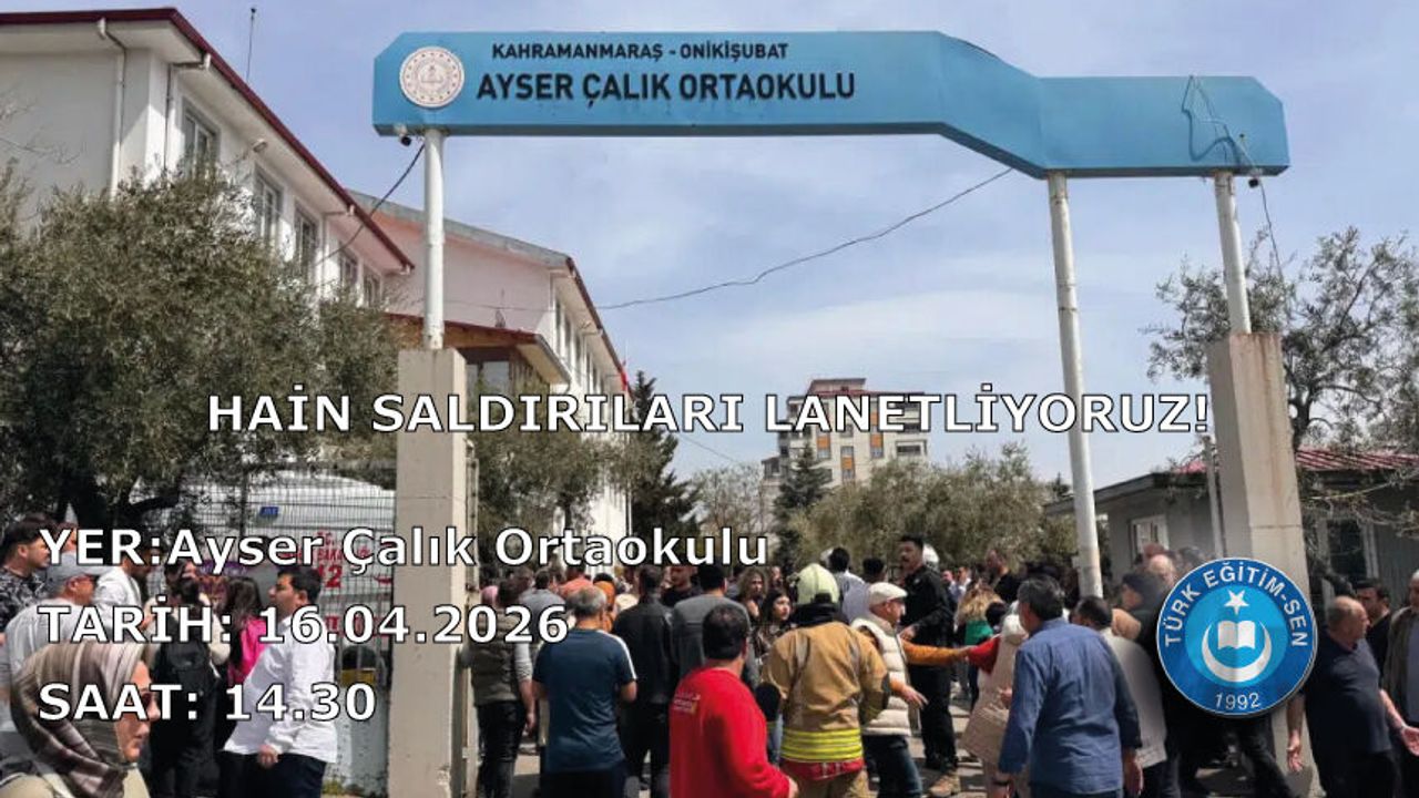 Türk Eğitim-Sen Genel Başkanı Talip Geylan, 16 Nisan 2026 tarihinde (Bugün), hain saldırının yaşandığı Kahramanmaraş’ta bulunan Ayser Çalık Ortaokulu’nda basın açıklaması gerçekleştirecektir.