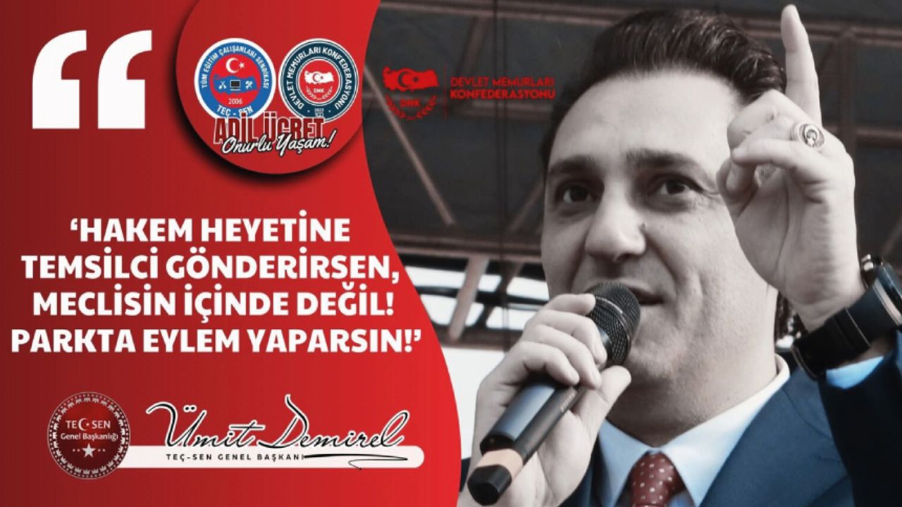 İki ay önce memur ve emekli için toplu sözleşmeye katılan parti sendikalarının hakem heyetine ‘noter’ deyip, daha sonra hakem heyetine temsilci göndererek hakem heyetinin toplanmasını sağladıklarını hayretle izlemiştik. Oysaki hakem heyetine bu parti sendikaları temsilci göndermemiş olsaydı. Yasa gereği hakem heyeti toplanamayacak ve memur ve emeklinin zam ve tazminat belirleme yetkisi TBMM’ye bırakılacaktı.