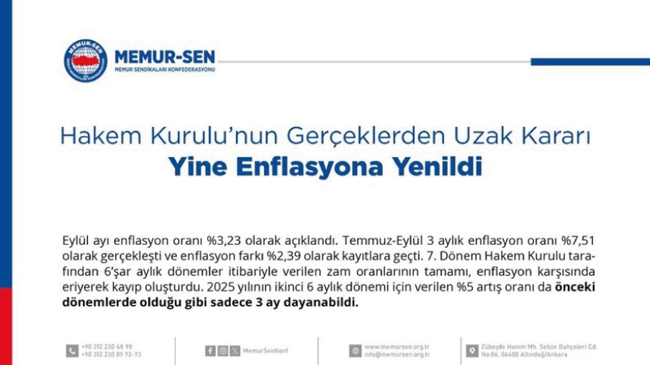 Hakem Kurulu’nun Gerçeklerden Uzak Kararı Yine Enflasyona Yenildi Eylül ayı enflasyon oranı %3,23 olarak açıklandı. Temmuz-Eylül 3 aylık enflasyon oranı %7,51 olarak gerçekleşti ve enflasyon farkı %2,39 olarak kayıtlara geçti. Acilen “Enflasyona uydurulmayan maaşlar, maaşları sürekli ezen enflasyon” sarmalından kurtulmamız gerekmektedir. Kamu İşveren Heyeti’nden beklentimiz; yanlışını görmesi, Hakem Kurulu Kararı uygulamaya geçmeden bu yanlıştan acilen dönmesi, TBMM’de gerçekleşecek bütçe görüşmelerinde bu yanlışı telafi edecek ve sosyal devlet anlayışına yakışacak iyileştirmeyi hayata geçirmesidir.