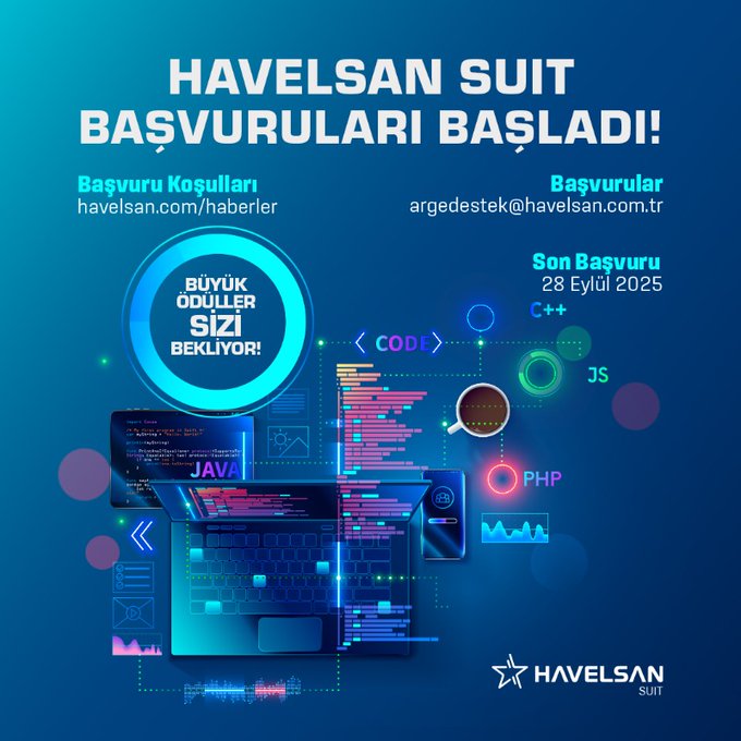 HAVELSAN SUIT 2025-2026 Başvuruları Açıldı! Üniversitelerin Bilgisayar, Yazılım, Elektrik Elektronik, Yapay Zekâ, Endüstri ve Mekatronik Mühendisliği vb. faaliyet alanlarımızda eğitim gören öğrenciler programa başvurabilir. Son başvuru tarihi: 28 Eylül 2025