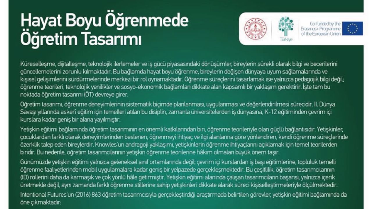 Hayat Boyu Öğrenmede Öğretim Tasarımı Küreselleşme, dijitalleşme ve iş gücü piyasasındaki değişimler bireylerin sürekli öğrenmesini zorunlu kılmaktadır. Bu nedenle hayat boyu öğrenme, bireylerin uyum ve gelişiminde kritik öneme sahiptir. Bu sürecin etkin yürütülmesi yalnızca pedagojik bilgiyle değil, aynı zamanda öğrenme teorileri, teknolojik yenilikler ve sosyoekonomik bağlamlarla bütünleşen öğretim tasarımıyla mümkün olmaktadır. EPALE, (Elektronic Platform for Adult Learning in Europe-Avrupa'da Yetişkin Öğrenimi Elektronik Platformu) bu çalışmada hayat boyu öğrenmede öğretim tasarımını ele alıyor. #HayatBoyuYanınızdayız