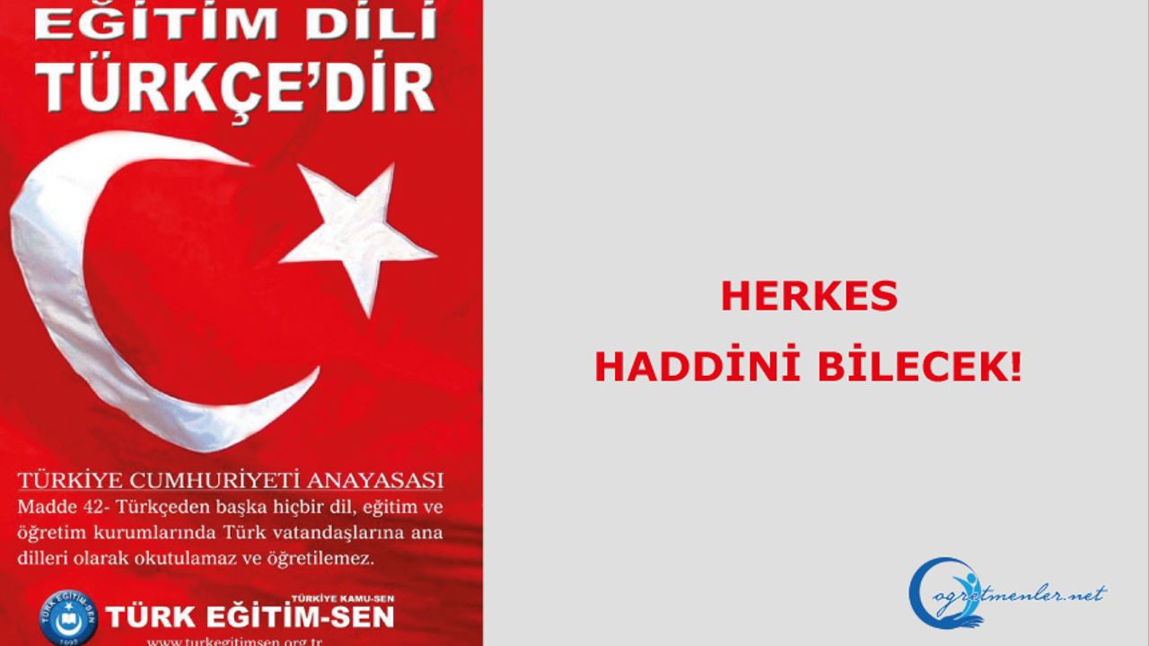 Türk Eğitim-Sen Van Şubesi olarak buradan tüm yetkililere ve kamuoyuna sesleniyoruz: Anayasamızın değişmez hükümlerine, resmi dilimize ve milli birliğimize karşı yapılan tahriklere karşı uyanık olun. Eğitim adı altında devletin diline, milletin birliğine saldıran zihniyet asla prim bulmamalıdır. Bizler, ülkemizin her bir ferdinin eşit haklara sahip, onurlu Türk vatandaşları olduğu gerçeğinden hareketle, çocuklarımızın tek bir bayrak altında, tek bir resmi dil ile eğitim görmesinin barış ve kardeşlik için şart olduğunu vurguluyoruz. Milli birlik ve beraberliğimizi hedef alan açıklamalar karşısında hukukun da gereğini yapacağına inanıyoruz. Türk Eğitim-Sen, eğitim çalışanlarının ve milletimizin değerlerinin yılmaz savunucusu olarak, bu tür meselelere karşı durmaya ve öğretmenlerimize sahip çıkmaya devam edecektir. Kamuoyuna saygıyla duyurulur.