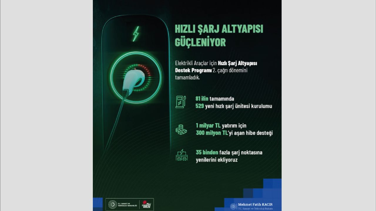 Elektrikli Araçlar için Hızlı Şarj Altyapısı Destek Programı'nda ikinci çağrı dönemi tamamlandı. 81 ilin tamamında 529 ünite kurulum desteği 35 bini aşkın şarj noktasıyla kesintisiz seyahat imkanı 1 milyar TL'lik yatırım için 300 Milyon TL’yi aşan hibe desteği