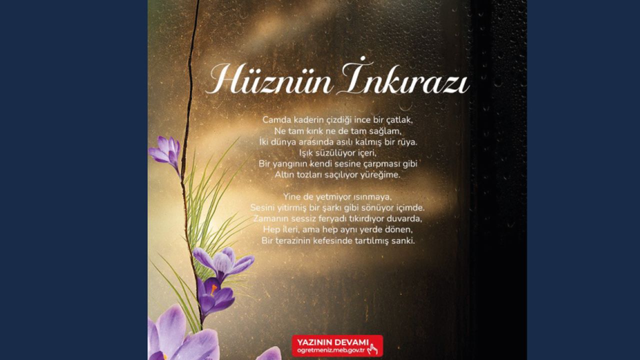 Mehmet Ali AL'dan "Hüznün İnkırazı" şiiri ÖğretmenİZ dergisinde! Camdaki çatlaklardan sızan ışığın peşine düşün... Okumak için http://meb.ai/UH2c0oy Sen de kalemini al, eserlerinle iz bırak! ÖğretmenİZ dergisinde yer al! Dergide yayımlanmasını istediğin çalışmalarını göndermek için https://meb.ai/9giDiI #öğretmeniz