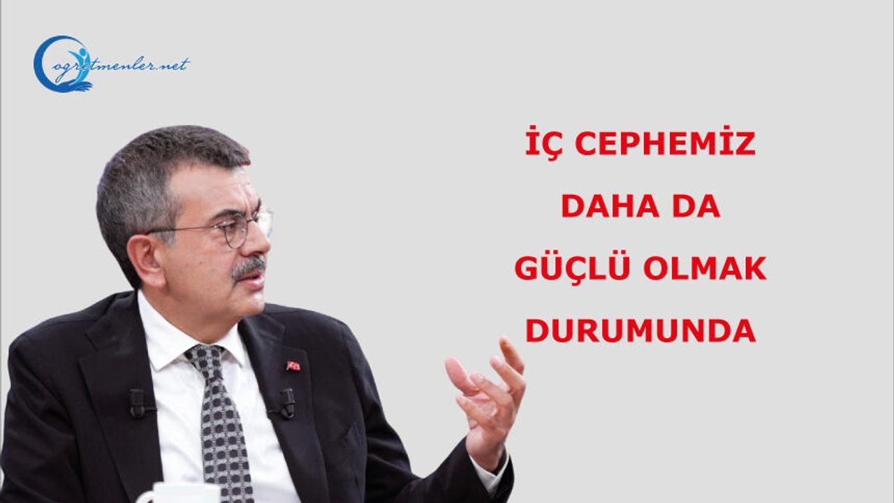 Hele ki yakın coğrafyamızda ağır sarsıntıların yaşandığı, bölgemizde istikrarsızlığın derinleştiği böylesi bir dönemde milli birliğimiz, kardeşlik zeminimiz ve iç cephemiz daha da güçlü olmak durumundadır. Bu vesileyle, iç cepheyi tahkim etme yönünde kararlı bir irade sergileyen Sayın Cumhurbaşkanımız Recep Tayyip Erdoğan'a ve Sayın Devlet Bahçeli'ye şükranlarımı arz ederim. Millî Eğitim Bakanlığı olarak biz de bu iradeyi gelecek kuşaklara aksettirecek bir kararlılık içerisinde hareket ediyoruz."