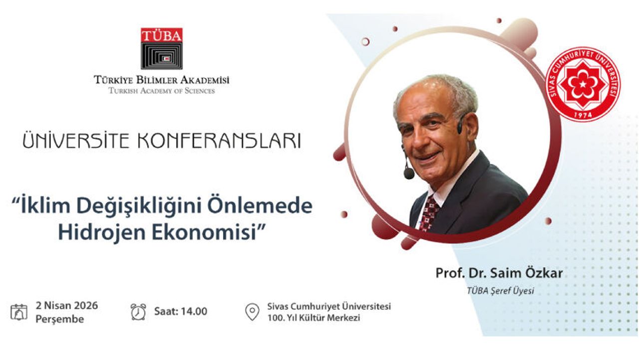 TÜBA Şeref Üyesi Prof. Dr. Saim Özkar, TÜBA Üniversite Konferansları Programı kapsamında Sivas Cumhuriyet Üniversitesi 100. Yıl Kültür Merkezi’nde 2 Nisan 2026 tarihinde saat 14.00’te "İklim Değişikliğini Önlemede Hidrojen Ekonomisi" konulu bir konferans verecek.